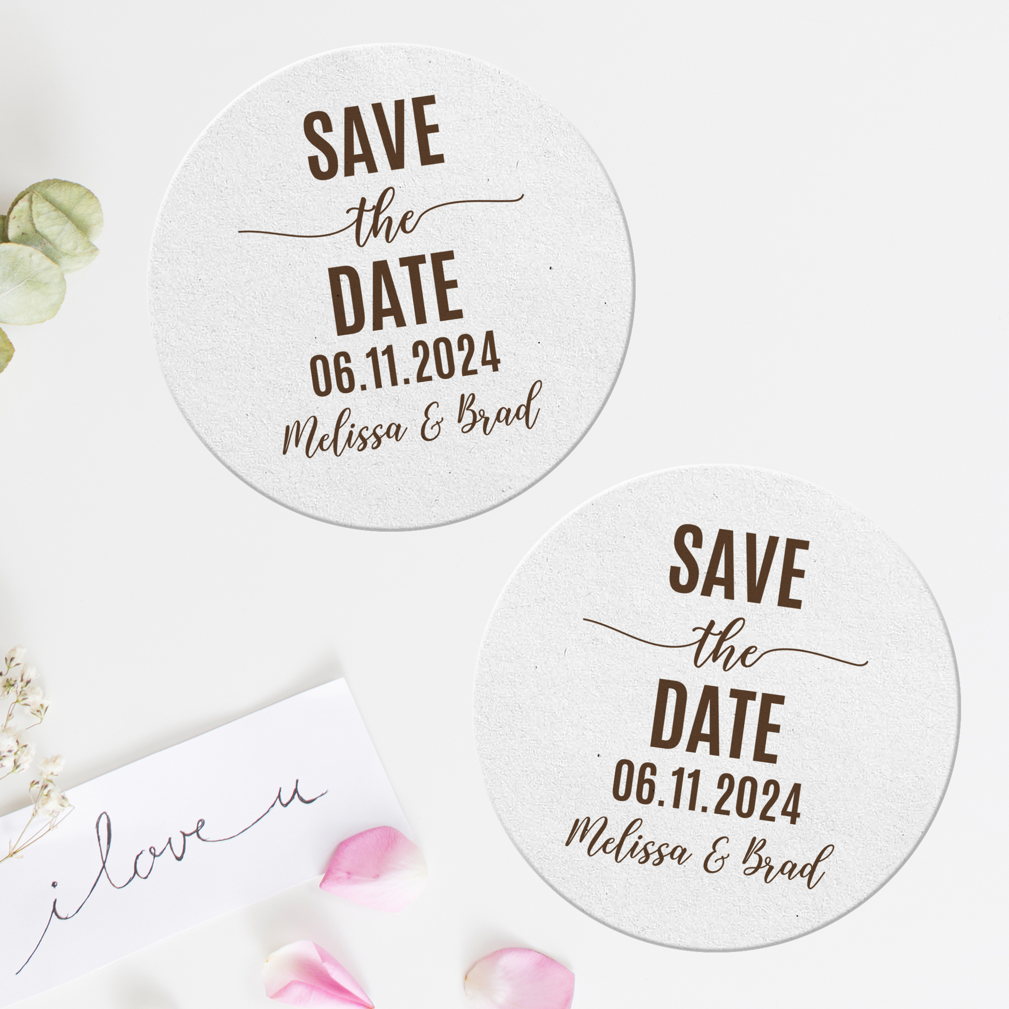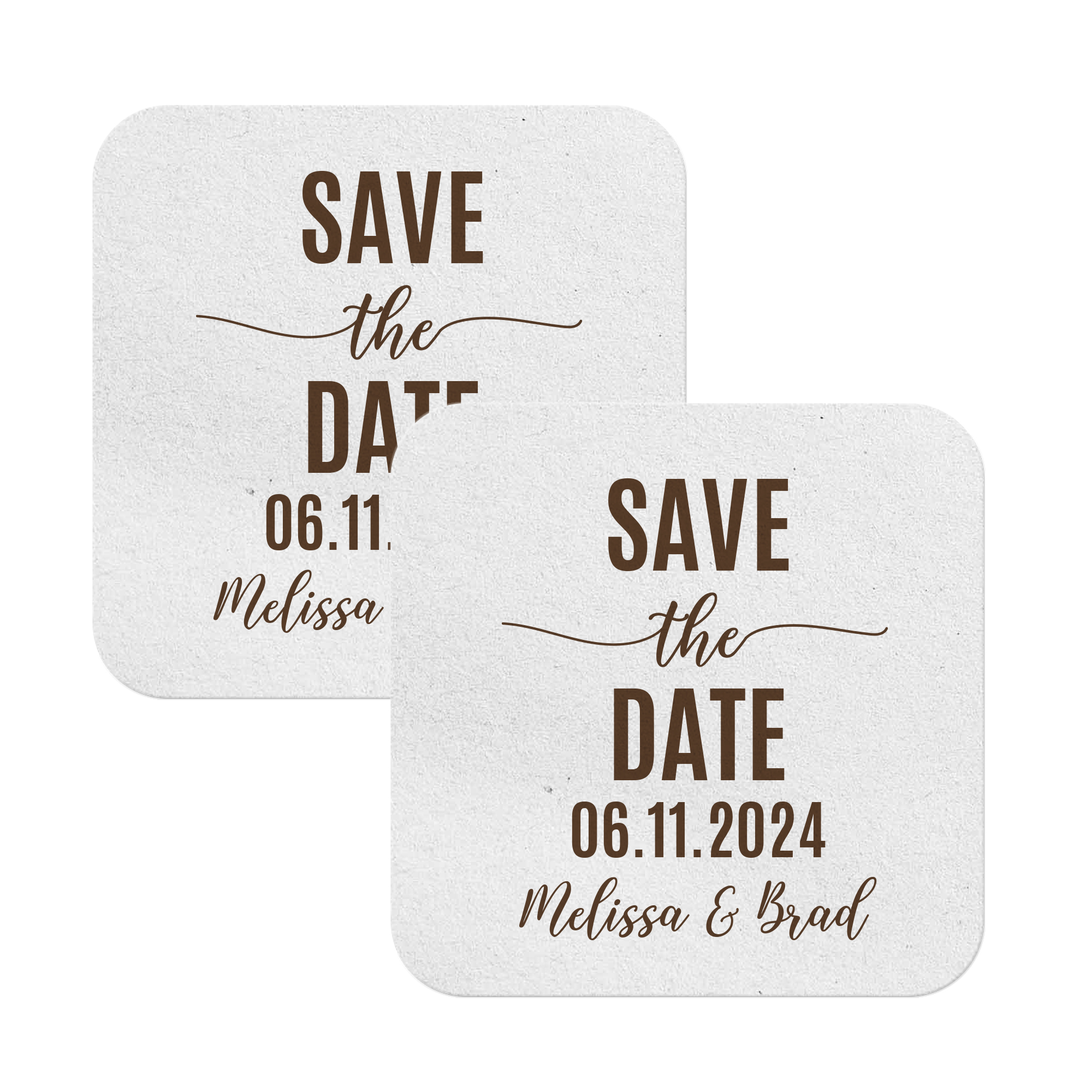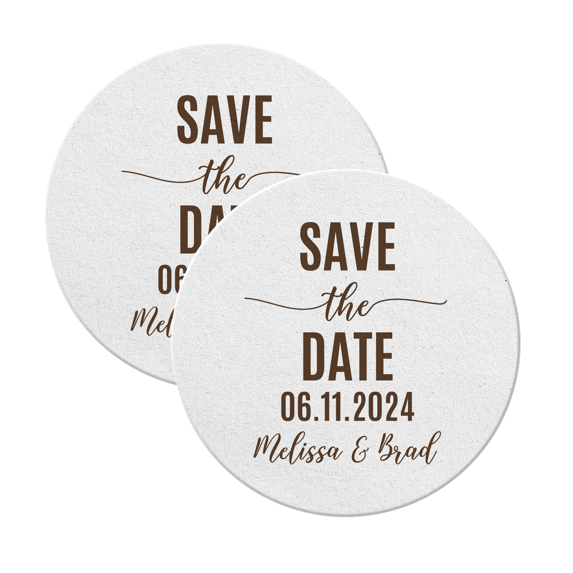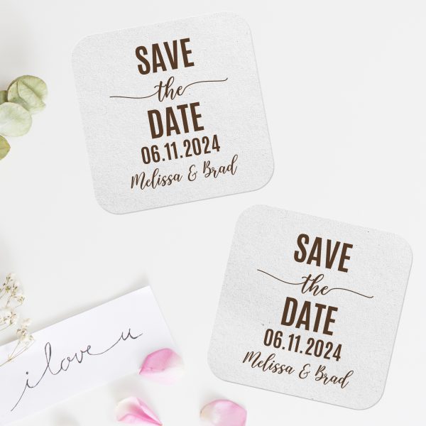 Elevate your special day with personalized save the date coasters! Our customizable pulpboard drinks coasters serve as versatile favors or table decorations, reflecting your unique style. Whether adorned with monograms, custom messages, or important dates, these coasters add a personal charm to your wedding. Not just functional beer coasters during the celebration, they also become cherished keepsakes for your guests. Explore our selection for a unique touch, creating lasting memories with these elegant custom-printed save-the-date coasters!
