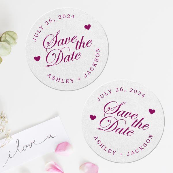 Elevate your special day with our customizable save-the-date coasters! Perfect as favors or table decor, these versatile pulpboard coasters embody your unique style. From monogram designs to personalized messages, they add a delightful touch to your wedding. Serving as both functional beer coasters and keepsakes, they create lasting memories for your guests. Explore our selection and infuse your wedding with personalized charm for truly unforgettable moments!