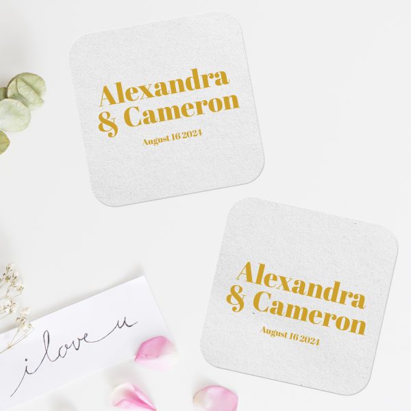 Enhance the significance of your special occasion with our collection of customizable save the date coasters! These versatile pulpboard drink coasters make perfect favors or table decorations. Crafted to embody your style, they offer an excellent way to add a personalized touch to your wedding. From monogrammed designs to bespoke messages and dates, these coasters not only serve as practical beer coasters but also double as cherished keepsakes for your guests. Explore our assortment to create enduring memories with these personalized wedding coasters!